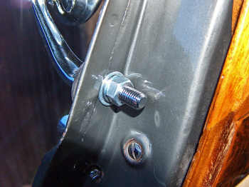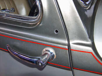 mirrors on the wings, as it gives a nice period look. However, the further the mirror is away from the driver, the less you see in it. In view of this I opted for door mount. The front doors on this car open to the rear, so mounting the mirrors on the A-pillar would place it in the way of getting in and out of the car. The hardest part of this job is drilling holes in your pride and joy. It took three glasses of Cabernet Sauvignon before I was brave enough to attempt it! |